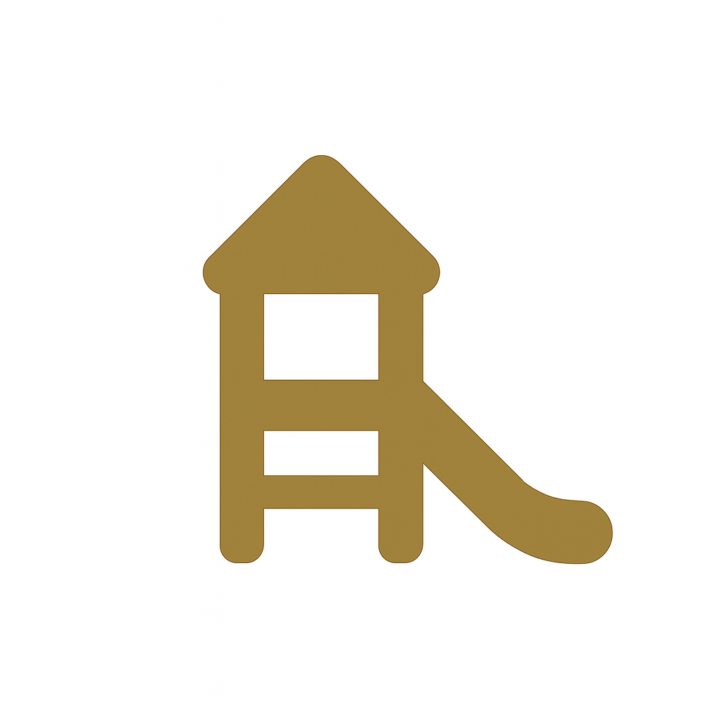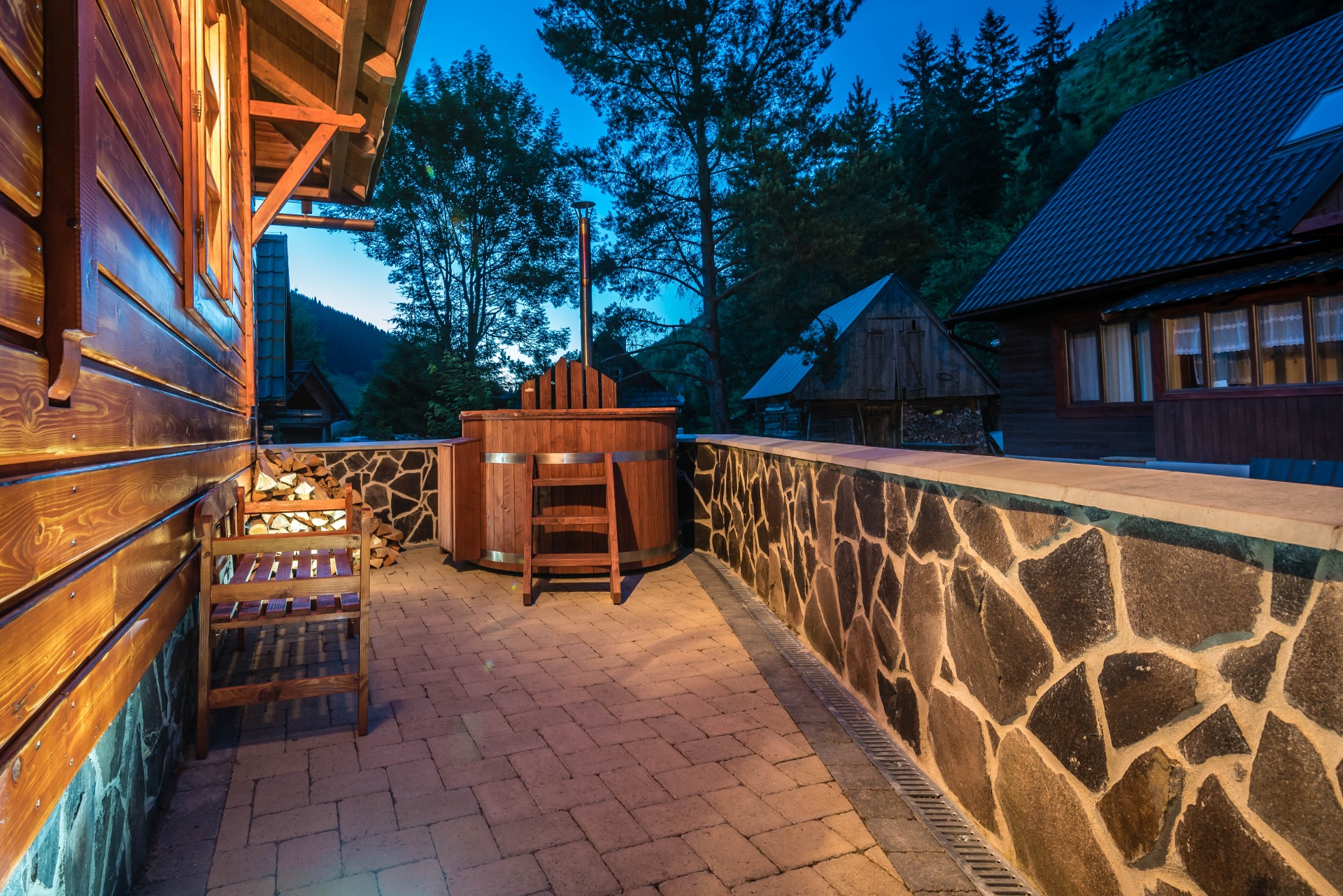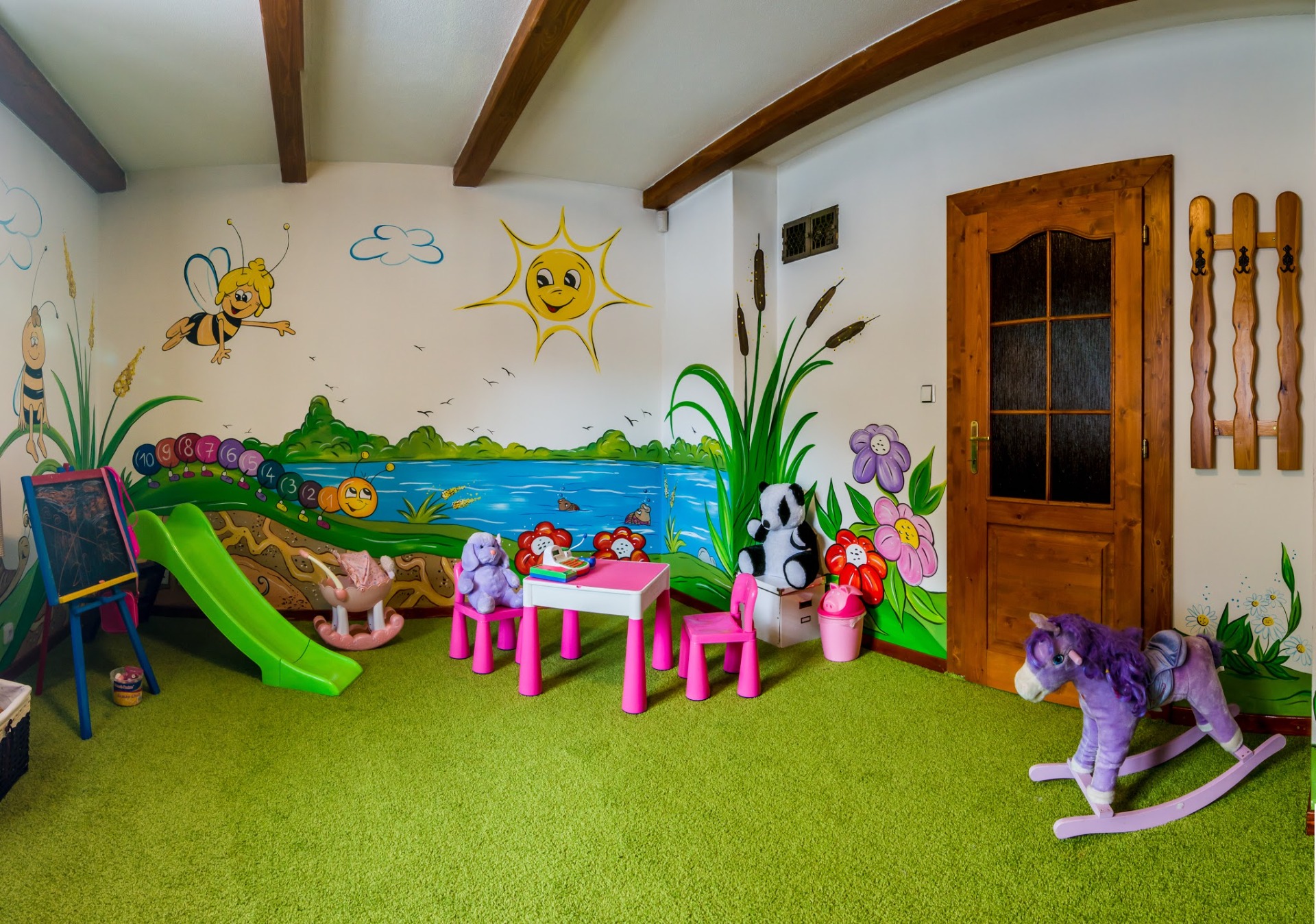 Súčasťou vonkajšieho vybavenia je krb s posedením a deti sa môžu vyhrať na detskom ihrisku so šmýkačkou a hojdačkami.